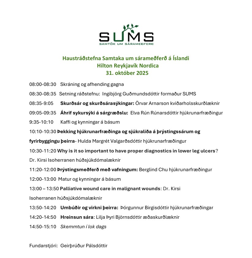 Haustráðstefna SUMS verður föstudaginn 5. nóvember á Hótel Hilton. Þemað í ár er óvenjuleg sár. Dagskráin er tilbúin og mikil tilhlökkun geta haldið ráðstefnu eftir svo langa bið.